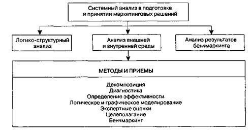 Рис. 1.12.Системный анализ в процессе принятия маркетинговых решений В процессе принятия оперативных решений применяются интуиция и суждение. При принятии стратегических решений используют рациональные методы экономического анализа и оптимизации. В целях обеспечения высокого качества и эффективности маркетинговых решений необходимо соблюдать следующие условия: • применять научные подходы и основы теории принятия решений; • изучать влияние экономических законов на эффективность маркетинговых • обеспечивать лицо, принимающее решение (ЛПР), качественной информа • использовать функционально-стоимостной анализ, методы прогнозирования • применять методы синтеза и анализа, структуризации и целеполагания; • обеспечивать условия сопоставимости вариантов решений; • соблюдать правовую защищенность принимаемого решения; • обеспечивать многовариантность решений; • использовать новейшие информационные технологии; • внедрять эффективные системы ответственности и стимулирования. При наличии альтернативных вариантов маркетинговых решений необходимо приводить варианты к сопоставимому виду и только после этого осуществлять сравнение и выбор решения. Приведение альтернативных вариантов маркетинговых решений к сопоставимому виду необходимо осуществлять, учитывая следующие факторы: • время; • качество объекта; • объем производства (сбыта); 1.5. Комплекс маркетинга и маркетинг-менеджмент в системе предпринимательства 65 • уровень освоенности продукции; • метод получения информации для принятия решения; • условия среды применения или эксплуатации объекта; • инфляцию; • риск и неопределенность. Для обеспечения сопоставимости альтернативных вариантов маркетингового решения следует соблюдать следующие правила: 1) альтернативных вариантов должно быть не менее трех; 2) в качестве базового варианта решения должен приниматься наиболее поздний 3) альтернативные варианты должны разрабатываться с учетом условий обеспе 4) для повышения качества и снижения затрат следует использовать современ 1.5. КОМПЛЕКС МАРКЕТИНГА И МАРКЕТИНГ-МЕНЕДЖМЕНТ В СИСТЕМЕ ПРЕДПРИНИМАТЕЛЬСТВА Разработка и принятие маркетинговых решений в системе предпринимательства базируются на учете различий и общности понятий маркетинга как философии, способа организации деятельности фирмы и как инструментария, воздействующего на процесс обмена, в который вступают и в котором непрерывно взаимодействуют субъекты этой системы. Теория взаимодействия требует интегрированного применения на практике этих трех аспектов понимания маркетинга. Ф. Котлер (1973) показал различие между маркетингом как философией и маркетингом как ремеслом. Если все внимание сосредоточить на способах, приемах и инструментах маркетинга, то он неизбежно представляется как ремесло, что явно недостаточно в условиях все возрастающей конкуренции. Знания маркетинга только узким кругом специалистов (отдел, группа маркетинга) на фирме становится недостаточно. Необходимо, чтобы маркетинг как философия предпринимательства, как концепция бизнеса овладел и руководил всеми работниками, функциями и отделами организации. Маркетинг, превращаясь в склад ума, пронизывая деятельность каждого работника — от клерка до высшего руководителя, создает предпосылки и условия эффективного предприн