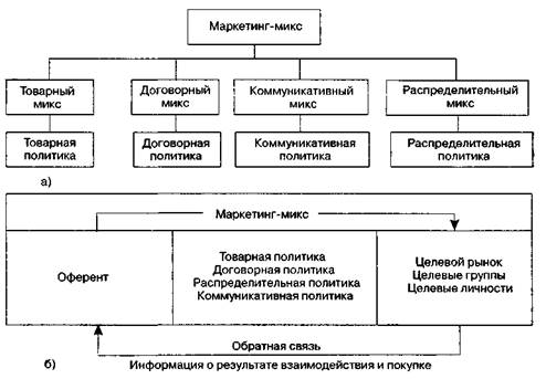 Рис. 1.13.Схема структуры (а) и взаимодействия (б) маркетинга-микса ким мероприятиям, как анализ и обоснование каналов сбыта, маркетинг-логистика, политика торговли, политика средств сбыта, политика размещения производительных сил, политика местонахождения потребителей и рынков, политика поставок, политика складирования готовой продукции и т. д. Задача коммуникативной политики — организация взаимодействия предприятия — изготовителя (или распределителя) продукции со всеми субъектами маркетинговой системы для обеспечения стабильной и эффективной деятельности по формированию спроса и продвижению товаров и услуг на рынок с целью удовлетворения потребностей покупателей и получения прибыли Эффективная коммуникативная политика базируется на таких мероприятиях, как планирование и организация бизнес-коммуникаций, т. е. взаимоотношений с партнерами, конкурентами и потребителями, реклама, стимулирование сбыта, продвижение бренда, организация связи с общественностью и личная продажа. В отличие от классического понимания коммуникативного микса авторы данного учебника разделяют точку зрения ученых и практиков, которые расширяют структуру коммуникативного микса путем включения в него мероприятий по формированию процесса продвижения бренда и оптимизации личностных и межфирменных коммуникаций, общений, взаимодействий. Цели и результаты применения субмикса маркетингового инструментария различаются в зависимости от вида проводимой политики маркетинга. Например, целью товарной и договорной политики является создание предложения для рынка. Задача распределительной политики — представление, обеспечение готовно- 1.5. Комплекс маркетинга и маркетинг-менеджмент в системе предпринимательства Таблица 1.13. Инструменты маркетинговой политики