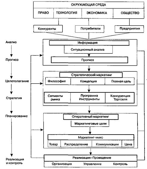бочие места и должности. Образование рабочих мест и должностей может осуществляться по направлениям (например, покупка, логистика, сбыт, маркетинг) или по объектам (например, продукт, рынок, группа покупателей, регион). Применение первого признака приводит к образованию функциональной структуры, а второго — к дивизиональной структуре. Если используются оба признака, то образуется гибридная структура управления. Обоснование, выбор и использование орга-низационных структур в системе маркетинга-менеджмента являются существенными составляющими комплекса задач маркетинга, который более полно рассматривается в главе 3 учебника. Маркетинг-менеджмент как функция предпринимательской деятельности выполняет роль регулятора причинно-следственных связей между спросом и предложением на основе непрерывного отслеживания поведения потребителей и механизма адаптации предприятия к постоянно меняющейся экономической конъюнктуре на рынке. Благодаря своему гносеологическому началу и коммуникативной направленности маркетинг-менеджмент опосредует мотивацию взаимодействия фирмы в конкурентной борьбе за максимизацию ее прибыли и одновременно обеспечивает максимизацию общественного продукта. В этой связи маркетинг-менеджмент может быть эффективным, если он ориентирован на потребителя и окружающую среду, на координацию стратегических и тактических мероприятий плана маркетинга. Важнейшие этапы и обратные связи процесса маркетинга-менеджмента приведены на рис. 1.17 [136]. На этапе анализа исследуются возможные стратегические и тактические проблемы поведения элементов маркетинговой системы: окружающей среды, покупателя, конкурентов, торговли. Результатом анализа должны быть сильные и слабые стороны предприятия в сложившейся ситуации на рынке, т. е. необходимо получить ответ на вопрос: где мы находимся? Этап прогнозирования предполагает рассмотрение относительных маркетинговых факторов для обнаружения шансов фирмы в будущем. При этом исследуются тенденции в поведении покупателей и конкурентов, а также развитие рынка и сбыта в