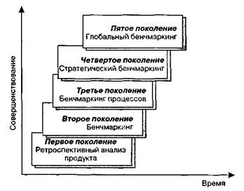 Процесс эволюции бенчмаркинга аналогичен классической модели «переход от искусства к науке». Как показывает рис. 2.16, первым поколением, или товарным бенчмаркингом, можно считать ретроспективный анализ продукта, т. е. закупку товаров и услуг конкурирующих предприятий с целью создания их аналогов. Второе поколение — бенчмаркинг конкурентоспособности получил развитие в 1976-1986 гг. благодаря деятельности фирмы Xerox. Третье поколение