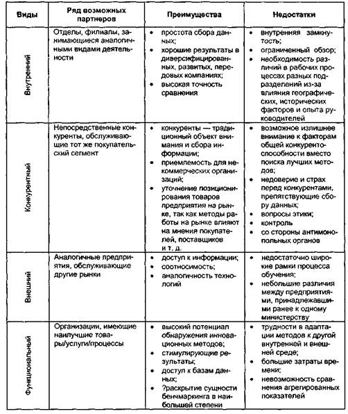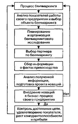 Рис. 2.17.Примерная схема процесса бенчмаркинга • отсутствие необходимых НИОКР; • недостаток информации об иностранных технологиях. Как видно, бенчмаркинг способствует решению по крайней мере трех из вышеназванных проблем. На первом этапе бенчмаркинга необходимо связать неудовлетворительные результаты функционирования фирмы с неэффективностью организации некоторых из ее рабочих процессов. Например, корпорация Xerox использует для этого перечень из 10 вопросов. 1.Какие товары или услуги поставляются покупателям? 2. Какой фактор является критически важным для успеха данной функции? 3. Какие факторы вызывают наибольшие трудности? 4. Какие факторы имеют значение для удовлетворения покупателей? 5. Какие актуальные проблемы были выявлены в подразделении? 6. Где в подразделении чувствуется давление со стороны конкурентов? 7. Каковы важнейшие затраты или факторы, вызывающие затраты? 8. На какие функциональные области приходится наибольший процент затрат? 9. В каких функциональных областях заложены наибольшие возможности для 130 Глава 2. Маркетинговые исследования и бенчмаркинг 10. Какие функциональные области оказывают наибольшее влияние на дифференциацию продукции по сравнению с конкурентами на рынке? Обобщая данный перечень, можно сказать, что объектом бенчмаркинга должен стать процесс, который (в соответствии со стратегиями конкуренции М. Портера): • либо дифференцирует предприятие по отношению к конкурентам; • либо соответствует наибольшему объему затрат в цепочке создания добавлен Отметим, что сравнение рыночных долей, цен и ассортимента не следует относить к бенчмаркингу — это сфера деятельности традиционных маркетинговых исследований. Принципиальное отличие бенчмаркингового исследования заключается в том, что оно обращено внутрь предприятия-партнера, изучая его технологии, как производственные, так и управленческие. Чтобы составить перечень процессов предприятия, можно воспользоваться избыточной моделью Международной клиринговой палаты по бенчмаркингу, которая классифицирует процессы по 13 направлениям, внутри которых выделены до 40 частных процессов1: • исследование рынка; • разработка стратегии; • разработка продукции (услуг); • организация продаж; • производство и поставка продукции; • организация сервиса; • обслуживание заказчика и выписка счетов; • управление человеческими ресурсами; • управление информационными ресурсами; • управление финансовыми и материальными ресурсами; • управление экологией;