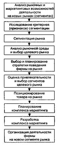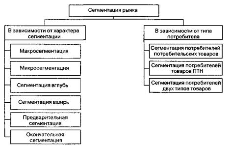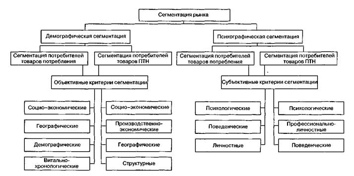 Рис. 2.19.Процесс сегментации рынка • окончательную сегментацию — завершающую стадию анализа рынка, проведение которой регламентируется возможностями самой фирмы и условиями рыночной среды. Она связана с поиском оптимальных сегментов рынка в целях позиционирования на них товаров, отвечающих спросу потребителей и возможностям фирмы. В зависимости от типа потребителя товара или услуг различают сегментацию потребителей товаров потребительского спроса и потребителей товаров производственно-технического назначения (ПТН). Сегментация рынка может осуществляться по различным критериям (объективным и субъективным признакам) (рис. 2.21). В теории и на практике наибольшее применение находят две группы критериев сегментации — социоэкономи-ческие и психологические. Последние ориентированы на отношения, поведение субъектов системы маркетинга. Первая группа критериев сегментации включает объективные признаки и является базовой для второй группы. Поэтому сегмен-