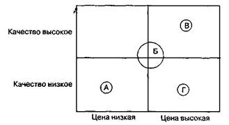 Рис. 2.22.Карта позиционирования продуктов по параметрам функции «качество-цена» При построении карт позиционирования могут приниматься различные цары характеристик, исследуемых продуктов (например, режимы стирки и температура стирки или же температура стирки и расход стирального порошка -г- для стиральных машин). Для закрепления позиций на рынке среди конкурентных фирм осуществляют диф-ференциацикэ| продуктов. Как отмечалось выше, дифференциация может иметь разные направления. Можно осуществлять продуктовую, ценовую, сервисную, кадровую и имиджевую дифференциации [45]. Любая дифференциация призвана обеспечить такое предложение фирмы или ее основных факторов производства и имиджа, которые превосходили бы соответствующие показатели конкурирующих организаций. На практике дифференциация может осуществляться как по одному направлению, так и по их комплексу, т. е. по нескольким направлениям одновременно. Правильно организованное позиционирование рынка является предпосылкой эффективной разработки комплекса и плана маркетинга.