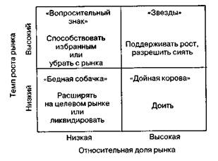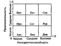 Рис. 2.23.Типология рынков — модель «Бостон консалтинг труп» Модель «Маккинзи» («Привлекательность рынка — преимущества в конкуренции») представляет собой развитие предыдущей модели. Матрица этой модели включает девять позиций фирмы, в зависимости от уровня привлекательности рынка и преимущества на рынке по отношению к конкурентам. Наиболее характерные положения стратегий находятся по углам матрицы. Ж.-Ж. Ламбен предложил многокритериальную матрицу для интерпретации стратегических позиций в условиях динамики привлекательности и конкурентоспособности рынка (рис. 2.24) [67]. В зоне С рекомендуется стратегия агрессивного роста, в зоне А — стратегия продолжения деятельности без инвестиций (деинвестирование), в зоне В — стратегия селективного роста, в зоне Д — стратегия низкой активности. Промежуточные зоны дают характеристику менее четким стратегиям, которые могут иметь место на рынке. Индикаторами привлекательности и конкурентоспособности рынка могут выступать различные критерии, а не только относительная доля рынка и темпы роста рынка (рис. 2.25).