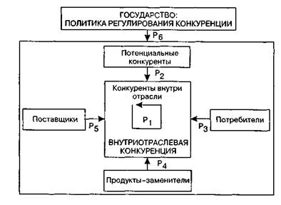 Рис. 2.24.Многокритериальная матрица Выбор индикаторов — тонкий процесс, требующий не только знаний, но и опыта маркетинговой деятельности при соблюдении следующих условий: • при оценке конкурентоспособности фирмы следует ориентироваться на уро • при сравнении индикаторов следует приводить их к сопоставимому виду с по • оценки конкурентоспособности должны отражать не только текущий, но и ожи • анализ должен заканчиваться итоговой оценкой привлекательности рынка то М. Портер предложил концепцию учета пяти конкурирующих сил рынка (рис. 2.26). Эта концепция соперничества исходит из того, что способность фирмы реализовать свое конкурентное преимущество на базовом рынке зависит не только от уровня прямой конкуренции, но и от роли конкурентных сил. Проявление конкурентных сил определяется действиями потенциальных конкурентов на этом рынке, появлением или наличием продуктов-заменителей, потребителей, поставщиков и действиями конкурентов внутри отрасли. Именно взаимодействие пяти сил, по М. Портеру, определяет потенциал рентабельности товарного рынка. Однако степень проникновения в отрасль, на рынок кроме этих сил зависит еще и от политики в области регулирования конкуренции, которую проводит государство. Поэтому при анализе конкурентной среды целесообразно учитывать влияние на нее шести сил, включая в их состав и силу государственной политики в области регулирования конкуренции. Примером организации такой политики является создание в 1991 г. Антимонопольного комитета РФ, который призван осуществлять государственную политику по развитию товарных рынков и конкуренции, мероприятия по ограничению монополистической деятельности в стране. Исследования М. Портера показали, что: • как крупные предприятия, нацеленные на овладение большой долей рынка, так Глава 2. Маркетинговые исследования и бенчмаркинг