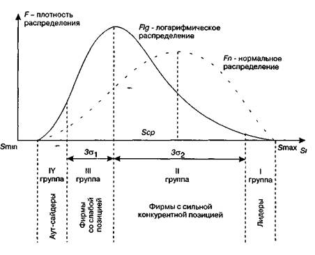 Для условий AS^ > О, Д5С = 0, Д5С < 0 определяется влияние собственной фирмы на динамику рыночной доли соответственно при Д56 > О, Д56 = О, Д56 < 0. Принимая логарифмическое или нормальное распределение рыночных долей конкурентов, определяют конкурентную позицию фирмы. При этом среднеарифметическая рыночная доля является разделяющей линией между слабыми и сильными позициями (рис. 2.28). Для определения границ групп-аутсайдеров, фирм со слабой, сильной конкурентной позицией и лидеров рынка устанавливают: минимальное и максимальное значение доли среди фирм; среднеарифметическую рыночную долю для всех фирм, находящихся на анализируемом рынке (5m = 1/JV); число слабых (NJ и сильных (N2) фирм. Затем по каждой группе фирм рассчитывают средние доли в группах: