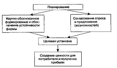 Рис.3.1. Сущность планирования Планирование как процесс разработки плана — это непрерывный поиск и использование новых путей и способов совершенствования деятельности предприятия в постоянно меняющихся условиях рыночных отношений. План может рассматриваться как модель поведения (настоящего или будущего) фирмы, как система мероприятий, направленных на достижение поставленных менеджментом целей. План предприятия включает систему мероприятий, необходимых для достижения тех или иных целей, их содержание, обеспеченность ресурсами, объемы, методы, последовательность и сроки выполнения работ по производству и реализации продукции. План может рассматриваться и как совокупность прогнозов и социально-экономических целей, достижение которых обеспечивается использованием определенных средств и методов. В отличие от программирования планирование обеспечивает систематическую, сбалансированную увязку целей организации с ее потенциальными возможно- 3.1. Цели, задачи и виды планирования 175 стями по производству и реализации продукции с целями коммерческого поведения потребителей этой продукции. При помощи планирования достигаются согласование и координация деятельности в системе вертикальных и горизонтальных уровней управления предпринимательскими структурами, что определяет эффективность целеполагания, формирование и использование рациональной системы показателей деятельности, возможность более точно определить потребность в необходимых ресурсах (рис. 3.2).