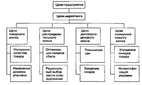 Рис. 3.3.План маркетинга в системе производственного планирования Необходимость систематического планирования маркетинга вызывают следующие причины: • неустойчивость, постоянные изменения факторов окружающей среды, что от • рост значимости и эффективности маркетинговой политики в системе приня • сложность согласования и упорядочения мероприятий предприятия при фор • рост числа и мощности создаваемых предприятий, которые требуют маркетин • интернационализация рынков и конкуренции; • нестабильность социальной, правовой и экономической информации; • интенсификация капитала предприятий; • постоянный рост числа инноваций и нововведений; 3.1. Цели, задачи и виды планирования 179 • непропорциональный рост затрат на маркетинг; • возможность снижения предпринимательского риска. Планирование маркетинга и его целей тесно взаимосвязано с планированием деятельности предприятия и его целями. Цели деятельности предприятия могут быть количественными и качественными. К количественным целям можно отнести: объем прибыли, рост прибыли на инвестированный капитал; объем оборота; долю рынка; производительность труда и др. Качественные цели в основном связаны с имиджем, престижем фирмы, охраной окружающей среды, социальной защитой работающих и неработающих граждан, поддержкой и спонсорингом общественных организаций и мероприятий. Цели маркетинговой деятельности (цели маркетинга) выступают как инструмент обеспечения целей предприятия и, как правило, связаны с поддержанием или увеличением доли фирмы на действующих рынках, с ростом доли фирмы на рынках за счет охвата и продвижения на другие рынки или ниши (рис. 3.4). Главная цель маркетинга достигается благодаря осуществлению основных целей, таких как улучшение качества и дизайна продукта; рационализация распределения и сбыта товара; совершенствование ценообразования и стимулирование покупателей; оптимизация коммуникативных процессов в системе маркетинга.