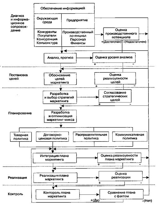 ТОВАР В СИСТЕМЕ МАРКЕТИНГАDate: 2015-10-07; view: 972. ПРОЦЕСС И ТЕХНОЛОГИЯ ПЛАНИРОВАНИЯ КОМПЛЕКСА МАРКЕТИНГА Планирование маркетинга является необходимым элементом системы организации рыночных отношений на всех уровнях экономики. Его сущность, с одной стороны, заключается в упреждающем воздействии на координацию маркетинговой деятельности той или иной социально-экономической системы в рамках заранее выбранной траектории (стратегии) ее поведения. С другой стороны, планирование маркетинга — это процесс заблаговременной разработки, принятия и оценки взаимосвязанной совокупности маркетинговых решений, осуществление которых позволяет увеличить вероятность благоприятного исхода согласования спроса и предложения, удовлетворения потребности покупателя и обеспечения запланированной прибыли. Процесс планирования маркетинга — это упорядоченная совокупность стадий и действий, связанных с ситуационным анализом окружающей среды, постановкой 3.2. Процесс и технология планирования комплекса маркетинга 183 целей маркетинга, осуществлением планирования (разработка плана), реализацией плана маркетинга, контролем за выполнением плана маркетинга (рис. 3.5). Планирование маркетинга основывается на текущих и перспективных целях предприятия (или иной предпринимательской структуры), на анализе сложившейся ситуации его поведения. Цели маркетинга, как совокупность показателей и качественных характеристик, отражают содержание результатов маркетинговой деятельности предприятий за конкретный промежуток времени. В рамках основных целей предприятия маркетинговые цели должны характеризовать: • производственно-технологическую деятельность, т. е. обеспечивать маркетин • хозяйственно-экономическую деятельность, т. е. создавать такие маркетинго • инновационную деятельность, т. е. постоянное обновление технических средств • социальную деятельность, т. е. формирование таких маркетинговых коммуни • экологическую деятельность, т. е. организацию маркетинга в рамках учета фак Цели маркетинга могут быть связаны как с показателями результатов деятельности (прибыль, объем продаж, доля рынка и т. д.), так и с направлениями маркетинговой деятельности (обеспечение товарного ассортимента, снижение цен, улучшение рекламных коммуникаций, совершенствование каналов и путей сбыта и т. д.). Систематизация, упорядочение целей маркетинга могут осуществляться путем разработки дерева целей маркетинга, которое включает цели, задачи, мероприятия для их достижения, согласованные с субъектами маркетинговой системы. Дерево целей позволяет детализировать общие цели, оценить наиболее значимые для конкретной ситуации цели, определить комплекс задач и наметить маркетинговые мероприятия для их решения. Для определения реалистичных целей маркетинга проводится ситуационный анализ, основными этапами которого являются анализ окружающей среды, анализ потенциала или возможностей предприятия, анализ перспектив развития деятельности фирмы (рис. 3.6). Цели маркетинга являются реалистичными, когда удовлетворяются следующие основные требования: достижимость; гибкость; соизмеримость; конкретность; совместимость; приемлемость; динамичность целей. Достижимость целей определяется их реальностью в отношении трудности выполнения и согласованностью с потенциальными в