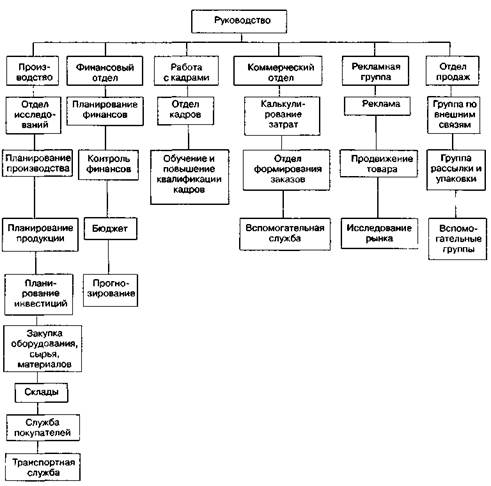 Рис. 3.11.Организационная структура фирмы, ориентированная на производство Проектирование организационных структур маркетинга (службы маркетинга) представляет собой деятельность по разработке и встраиванию таких структур в систему управления деятельностью фирмы. Организационные структуры служб маркетинга должны удовлетворять определенным требованиям, основными из которых являются: малое количество звеньев; создание условий для развития интегрированного маркетинга на предприятии; содействие фирме в постоянном удовлетворении потребностей существующих и потенциальных покупателей; обеспечение развития творчества и инновационной деятельности сотрудников; гарантия быстрой адаптации производимых продуктов к требованиям рынка; содействие росту объемов продаж и снижению себестоимости. Особенности производственной деятельности, отличие производственных потенциалов, различие в размерах и структуре потребляемых ресурсов, в объемах производства и сбыта продукции предопределяют индивидуальный подход к раз-