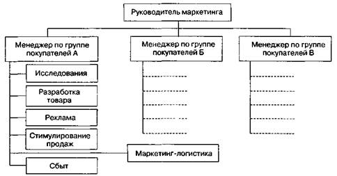 Рыночная организационнаяструктура маркетинга применяется для организаций, которые производят однородную продукцию. Ответственность за разработку и реализацию стратегий и планов маркетинговых мероприятий на каждом рынке возлагается на менеджеров по рынку, которые сотрудничают со специали- 3.3. Организационные структуры маркетинга 207 стами функциональных подразделений, где вырабатывается стратегия маркетинга для каждого рынка. Эта структура способствует улучшению координации служб при выводе товара на рынок, создает возможность комплексной разработки маркетинговых мероприятий, обеспечивает более достоверный прогноз рынка, так как лучше учитывает его специфику. В то же время рыночная структура характеризуется дублированием функций, низкой степенью специализации работы отделов, недостаточной гибкостью. Организационная структура маркетинга с ориентацией на покупателя (группу покупателей) основывается на проведении маркетинговой деятельности и маркетинговых мероприятий, дифференцированных по целевым группам покупателей (потребителей). Эта структура ориентируется на разработку стратегии маркетинга для каждой группы покупателей, поэтому для работы с каждой группой покупателей назначают руководителя. В центре внимания этой структуры находятся покупатели и их запросы, которые отличаются по структуре потребителей и привычкам (рис. 3.18). Благодаря постоянному контакту с покупателями, возможности обслуживания целевых групп покупателей (конечных потребителей, оптовых покупателей), а также реальным для развития и воспроизводства спроса (благодаря хорошему контакту с потребителями, знанию их привычек и склонностей к покупкам) условиям эта структура может применяться в случае неоднородного спроса.
