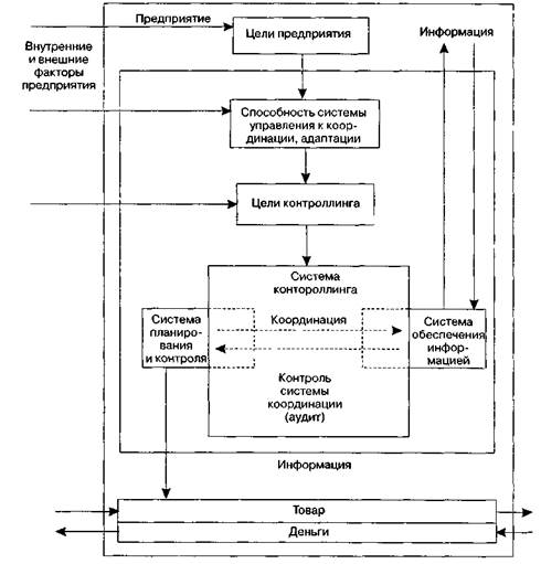 Рис.3.21. Контроллинг в многоступенчатой системе планирования и контроля ческий контроллинг информирует о необходимости внесения изменений в деятельность фирмы в будущем, повышает ее шансы на выживание в обстановке национальной и международной конкуренции (табл. 3.13). Если оперативный контроллинг связан с понятиями «затраты» и «доходы», то стратегический контроллинг занимается показателями риска и потенциала успеха. Таким образом, стратегический контроллинг является средством поиска целей, тогда как оперативный контроллинг — инструментом достижения целей. Система контроллинга как подсистема управления организацией включает координацию, планирование, анализ и контроль, информационное обеспечение (рис. 3.22). Организация такой системы предполагает наличие и использование методов получения и обработки информации; официальной статистической отчетности; интегрированной системы планирования и контроля; системы калькулирования расходов; программы снижения себестоимости; реальной системы показателей результатов деятельности; методик для оценки экономической эффективности производственной и инвестиционной деятельности; системы упреждающего поиска, контроля и оповещения руководства о возможных тенденциях в изменениях шансов и рисков в деятельности организации. Ответственность за осуществление организации и эффективное функционирование системы контроллинга возлагается на контроллера (не на контролера, т. е. специалиста, осуществляющего учет и анализ отчетной информации о деятельности фирмы, а на специалиста, обученного и способного выполнять функции и задачи контроллинга, т. е. менеджера по координации деятельности фирмы и ее структурных подразделений, по организации управленческого учета и планирования для разработки политики по обеспечению выживаемости фирмы в долгосрочной перспективе). Основные функции контроллера определяются целями организации — это учет; планирование; контроль; информационно-аналитическое обеспечение процесса принятия решений; поддержка координации и адаптации организационной систе- Глава 3. Маркетинг взаимодействия: интеграция и координация ^ма Таблица 3.13. Стратегический и оперативный контроллинг