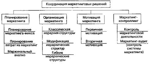 Маркетинг-контроллинг рассматривается как система организации контроллинга результатов маркетинга-менеджмента на предприятии. Эта система включает подсистемы контроля и аудита, которые предполагают осуществление планирования, организации, учета, контроля, ревизии и оценки результатов реализации концепций, стратегий и планов маркетинга, эффективности мероприятий, осуществляемых для достижения тактических и стратегических целей,маркетинга. Й16_________ Глава 3. Маркетинг взаимодействия: интеграция и координация в маркетинге Маркетинг-контроллинг в сфере маркетинга-менеджмента обеспечивает методическую и инструментальную базы для поддержки основных функций маркетинга-менеджмента (планирование, контроль, учет и анализ) в системе принятия управленческих маркетинговых решений. При этом следует иметь в виду, что маркетинговые мероприятия, пути и методы их реализации не являются предметом маркетинг-контроллинга. Маркетинг-контроллинг выступает как концептуальная и методическая основа интеграции и координации процесса управления маркетингом, как инструмент формирования и учета будущих обратных связей в системе управления маркетингом. Это означает, что маркетинг-контроллинг кооперирует и направляет взаимодействие всех ресурсов и субъектов процесса обеспечения эффективной маркетинговой деятельности, достижения целей маркетинга и соответственно целей фирмы в перспективе. Маркетинг-контроллинг занимает ведущее место в процессе координации принятия маркетинговых решений среди таких функций, как планирование, организация и мотивация (рис. 3.23).