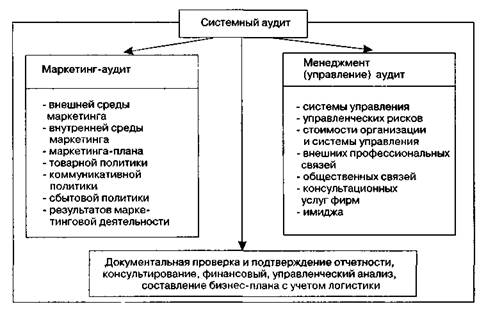Рис. 3.28.Метод GAP-анализа в маркетинг-контроллинге Третий этап развития аудита — ориентация на возможный риск при проведении проверок или при консультировании, на предупреждение и избежание риска. Это аудит, при котором исходя из условий бизнеса клиента проверка проводится выборочно, в основном там, где риск ошибки или мошенничества максимальный. Потребность в услугах аудитора возникла в связи со следующими обстоятельствами: 1) возможность получения необъективной информации со стороны администра 2) зависимость последствий принятых решений (а они могут быть весьма значи 3) необходимость специальных знаний для проверки информации; 4) частое отсутствие у пользователей информации доступа для оценки ее качества. Все это привело к возникновению общественной потребности в услугах независимых экспертов, имеющих соответствующую подготовку, квалификацию, опыт и разрешение на право оказания такого рода услуг. Аудиторские услуги — это услуги посредников, устанавливающих достоверность информации о различных процессах в организации. Для российской экономики характерен системный аудит: экономический, финансовый, управленческий, экологический, социальный, правовой, маркетинговый (рис. 3.29). В отличие от методов диагностики системный аудит основан на системе стандартов, в том числе международных стандартов учета, Гражданском кодексе РФ и других нормативных документах. Системный аудит призван заменить диагностику, так как он включает ее в себя и оказывает широкий спектр услуг. В настоящее время системный аудит только начинает осуществляться на отдельных этапах маркетинга предприятия. На практике его часто подменяют диаг-