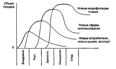 Для предупреждения стадии спада в жизненном цикле товара целесообразно увеличивать продолжительность стадий роста, зрелости путем заблаговременного введения на рынок до момента его насыщения одним товаром нового товара (рис. 4.8). Однако этот маневр доступен не каждому производителю, так как устранение разрыва между циклами требует проведения активной инновационной и маркетинговой политики, наличия соответствующих финансов и интеллектуального потенциала сотрудников. 4.2. Жизненный цикл товара 243 Продолжительность жизненного цикла колеблется достаточно сильно для разных товаров. Определенные резервы в удлинении жизненного цикла товара заложены в производстве и реализации не одного, а нескольких товаров. Причем эти товары могут в различных сочетаниях располагаться на различных рынках сбыта. Наиболее рациональными в этом случае являются решения по размещению на рынках сбыта не одного, а совокупности товаров с заранее запланированным сдвигом стадий их жизненных циклов. Формирование такого продуктового портфеля компании позволяет ей осуществлять сбалансированную производственно-сбытовую деятельность, которая обеспечивает постоянное получение прибыли и создает условия для маневренного использования капитала при осуществлении инновационной деятельности.