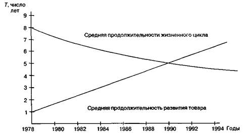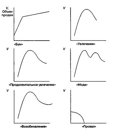 Наряду с типичным ЖЦТ (рис. 4.6) на практике могут иметь место особые случаи, когда форма кривой жизненного цикла недостаточно четко отражает различные стадии внедрения товара на рынок (рис. 4.9). Так, жизненный цикл товара достаточно популярного, со стабильным сбытом на протяжении длительного вре- 244Глава 4. Маркетинг взаимодействия: товарная политика в систеи мени описывается в виде кривой, которая называется «бум». Когда объем продаж товара резко возрастает, а затем резко падает, кривая ЖЦТ носит название «увлечение». Процесс реализации модных товаров характеризуется кривой жизненного цикла, которая называется «мода». Частный случай «моды» представляют кривые «возобновление» и «продолжительноеувлечение». Неудачное появление товара на рынке, непринятие товара рынком изображается кривой ЖЦТ «провал». Продолжительность всего жизненного цикла и его отдельных стадий зависит от типа и вида товара. Однако общей тенденцией как для товаров широкого потребления, так и для товаров производственно-технического назначения является сокращение цикла жизни товара, хотя средняя продолжительность времени развития товара растет (рис. 4.10).