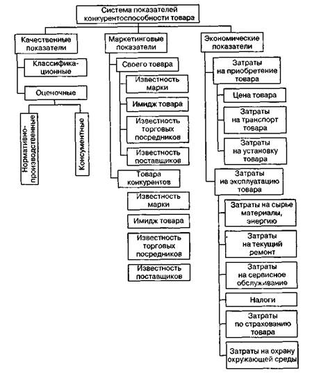Свойство товара может проявляться при его создании и при эксплуатации. Свойства могут характеризовать товар как объект проектирования (новизна, сложность, патентная чистота и т. д.), как объект производства (материалоемкость, энергоемкость и т. д.) и как объект потребления, эксплуатации (производительность, мощность, скорость, надежность, безопасность, расход материалов и т. д.). Основные составляющие качества различаются в зависимости от того, рассматривается ли качество товара или качество услуг. Качество товара включает следующие составляющие: функциональное соответствие, дополнительные функции, соответствие нормам и стандартам, долговечность, надежность, сервис, эстетичность, восприятие (репутация, имидж). Качество услуги включает следующие факторы: компетентность фирмы; надежность деятельности и обязательность фирмы; отзывчивость и внимательность сотрудников; доступность коммуникаций и общения; быстрое понимание потребностей клиента; безопасность обслуживания (в юридическом, финансовом и моральном отношениях); представительность инфраструктуры фирмы и культура обслуживания. Количественные характеристики какого-либо свойства товара, определяющие качество, называются показателями качества. Показатели качества могут классифицироваться по следующим критериям: характеризуемые свойства, способ измерения, способ использования, стадия определения и др. Конкурентоспособность товара характеризует не само по себе его качество, а степень соответствия качества данного товара показателям качества аналогичного по назначению товара конкурента. Таким образом, оценка конкурентоспособности товара подразумевает сопоставление значений показателей качества товара