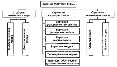 Рис. 4.14.Структура товарного микса Проведение эффективной товарной политики фирмы связано с двумя крупными проблемами. Во-первых, фирма должна рационально организовать работу в рамках имеющейся номенклатуры товаров с учетом стадий жизненного цикла; во-вторых, — заблаговременно осуществлять разработку новых товаров для замены товаров, подлежащих снятию с производства и выводу с рынка. Таким образом, фирме необходимо иметь и постоянно совершенствовать товарную стратегию, что позволит ей обеспечить устойчивую структуру ассортимента, постоянный сбыт и стабильную прибыль. Товарная стратегия разрабатывается на перспективу и может включать три стратегических направления по улучшению привлекательности имеющегося на фирме товарного микса (рис. 4.15): • инновацию товара; • вариацию товара; • элиминацию товара. Стратегия инновации товара определяет программу разработки и внедрения новых товаров. Однако выражение «новый товар» имеет самое различное толкование и используется как для обозначения усовершенствования, обновления существующих товаров, так и для характеристики абсолютно новых потребительских благ, которые впервые предоставляются потребителям. Необходимо правильно оценить значимость и назначение инновации, так как от этого зависит качество оценки риска, связанного с ее внедрением.
