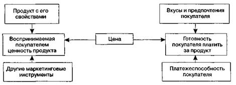 Цена — это денежное выражение ценности продукта, услуги, фактора производства в процессе обмена. Ценность — это значимость (польза) продукта, услуги, фактора производства для потребителя. Ценность продукта, услуги, фактора производства определяется как факторами предложения, так и факторами спроса. Для покупателя, приобретающего тот или иной товар, цена является «экономической жертвой». Покупатель постоянно сравнивает эту «жертву» со своим представлением о ценности (пользе) товара и приобретает товар тогда, когда, по его мнению, ценность товара, переведенная им в деньги, выше цены товара. Для продавца цена представляет собой вознаграждение за результат его труда. Связь между ценой и ценностью продукта представлена на рис. 5.1. Представленная связь относится как к потребительским, так и к промышленным благам. С точки зрения измерения ценности благ, конечно, могут наблюдаться различные подходы. Но в любом случае оценка полезности благ базируется на субъективных восприятиях покупателей, а не на каких-то «технико-объективных» свойствах благ.