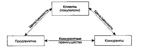 Рис.5.1. Связь между ценой и ценностью продукта Субъективная оценка полезности благ, как и восприятие цены, может зависеть от многих факторов. Выбор между альтернативными предложениями благ зависит не только от конкретной цены блага или желания клиента, но и от относительной цены блага. Покупатель выбирает то благо, которое приносит ему наиболее ощутимую нетто-ценность. Цена является центральным элементом конкурентной стратегии предприятия, которая включает в себя разработку мероприятий, направленных на выживание и победу в борьбе с конкурентами на рынке конкретной продукции. Чтобы достичь этих целей, предприятие должно осуществить внутреннюю оценку своих ресурсов и возможностей в сравнении с конкурентами, чтобы выявить свои сильные и слабые стороны. Предприятие должно также осуществить внешнюю оценку характера и устойчивости движущих сил конкуренции на конкретных рынках, а именно: а) соперничества существующих фирм; б) рыночной власти поставщиков производственных факторов; в) рыночной власти потребителей; г) угрозы появления новых фирм на рынке; д) угрозы появления продуктов-заменителей. Рассмотрение этих факторов завершается выработкой общей конкурентной стратегии предприятия, основанной либо на лидерстве в области затрат в целом по отрасли, либо на дифференциации продукта, либо на более узконаправленной деятельности, нацеленной на получение конкурентных преимуществ на ограниченном сегменте рынка. Конкурентное преимущество — это активы и характеристики фирмы (оборудование, позволяющее экономить затраты, торговые марки на технически прогрессивную продукцию, права собственности на сырье, материалы и т. д.), дающие ей преимущества над соперниками в конкуренции. Чтобы превзойти конкурентов в борьбе за потребителя на прибыльной и долговременной основе, предприятие должно в зависимости от природы рынка добиваться эффективности своих затрат и/или предлагать такую продукцию, которую покупатели предпочтут продукции других производителей. Первое позволяет предприятию выжить и победить в ценовой конкуренции, второе отражает его преимущество над конкурентами в области дифференциации продукта. Позицию предприятия в конкурентной среде можно представить в виде стратегического треугольника (рис. 5.2).
