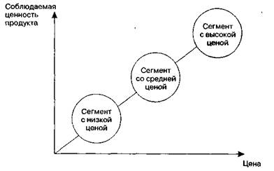 Рис. 5.2.Стратегический треугольник Предприятие в этом треугольнике находится в тесной связи с клиентами и конкурентами, причем эта связь обусловливается ценностью продукта и требуемой ценой. Чтобы успешно функционировать в конкурентной среде, руководству предприятия необходимо хорошо знать все стороны стратегического треугольника и возможные отношения между ними. Для позиционирования себя в конкурентном поле предприятие должно решить вопрос выбора целевого рынка: будет ли этот рынок широким (например, массовый рынок японских автомобилей) или узким (рынок спортивных автомобилей). Конкурентное преимущество предприятие может получить на одном и другом рынке либо за счет ценового лидерства (относительно низких цен), либо за счет широкой дифференциации продукции. Что касается самого продукта, то его качество должно высоко оцениваться покупателями, вызывать готовность клиентов заплатить за этот продукт больше, чем за продукты конкурентов, быть труднодостижимым для конкурентов. Если предприятие предлагает клиентам продукт, схожий с продуктами конкурентов, то конкурентное преимущество будет состоять в низкой цене по сравнению с ценами конкурентов. Но низкая цена может продержаться долго лишь в случае, если предприятие обладает преимуществами по затратам. Отсюда следует, что ценовой менеджмент связан с затратным менеджментом. Важными при рассмотрении цены как элемента конкурентной стратегии являются различные подходы к ее определению, а именно стартовать от продукта и выводить цену — или начинать с целевой цены и исходя из нее разрабатывать продукт. При первом подходе предприятие получает грубое представление о будущей цене. При втором — задается целевая цена, которая выступает в роли жесткого ограничителя затрат, связанных с разработкой нового продукта. При назначении целевой цены важную роль играет конкурентное сравнение. Здесь возникают следующие вопросы. Хочет ли предприятие предложить примерно аналогичный конкурентному продукт с ощутимо низкой целевой ценой по сравнению с ценами конкурентов? Или взять цену конкурента в качестве базы целевой цены и потом попытаться создать заметно лучший продукт? Однако здесь возникает проблема, связанная с фактором времени. Целевая цена должна равняться не на текущий уровень цен, а на будущие цены. Поэтому предпосылкой для правильного установления целевой цены в этом случае является надежный прогноз цены. 5.1. Сущность цены и ее роль как элемента конкурентной стратегии предприятия 289 С помощью цен можно выявить конкурентную позицию продукта (марки) предприятия, т. е. определить, какие другие продукты являются его конкурентами. Для этого можно воспользоваться картой «цена-ценность», оси которой образованы соблюдаемой ценностью продукта и ценой. На рис. 5.3 показана карта «цена-ценность» с тремя ценовыми сегментами: с низкой, средней и высокой ценой.