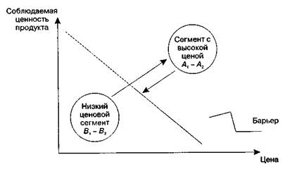 Рис. 5.3.Карта «цена-ценность» продукта Один продавец может быть представлен в одном или нескольких ценовых сегментах, с одной или несколькими марками продукта. Сколько ценовых сегментов нужно использовать, зависит от конкретной ситуации. Но независимо от числа сегментов одинаково важно то, что из позиционирования на карте «цена-ценность» вытекают стратегии и определенная структура конкуренции. Поэтому по возможности как можно раньше должна быть установлена целевая цена. Вместо последовательности «разработка продукта > затраты > >цена > позиционирование на рынке» процесс должен протекать в обратном направлении. В этом случае желаемое позиционирование на рынке потребует некой цены, которая определит приемлемые затраты, а они, в свою очередь, — определенного дизайнерского решения продукта. Одним словом, цена определяет затраты, а не наоборот. Эмпирические исследования в различных отраслях показали, что: а) конкуренция в пределах одного сегмента обычно более сильна, чем между раз б) в конкуренции между сегментами есть асимметрия. Понижение цены в сегменте с высокой ценой привлекает больше клиентов из сегмента с низкой ценой, чем понижение цены в сегменте низкого уровня — клиентов из сегмента с высокой ценой. Это изображено на рис. 5.4 для рынка с двумя ценовыми сегментами. Один из сегментов включает две элитные марки А1 и А2, второй — две марки с низкой ценой В1 и В2. Рисунок 5.4 показывает барьер, который разделяет сегмен-