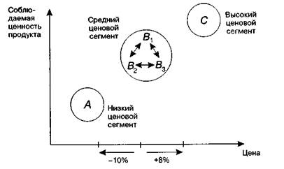 Рис. 5,4.Асимметрия с двумя ценовыми сегментами ты с высокой и низкой ценой. Барьер указывает, что снижение цены на одну марку сильнее повлияет на конкурентов этого же ценового сегмента. Вторая важная часть рис. 5.4 — это вид барьера. Снижение цены на дорогую марку A1 привлекает покупателей из сегмента с низкой ценой, которые могут проскальзывать через пунктирный барьер. Если же будет снижена цена марки В2, то покупателей из сегмента с высокой ценой это не привлечет. Само собой разумеется, что при снижении цены марки В2 сбыт ее может быть увеличен вследствие того, что будут привлечены клиенты марки B1 и вряд ли будут привлечены клиенты из дорогого сегмента.