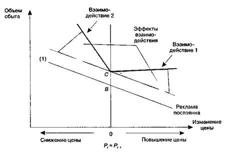 Фактическое воздействие (изолированное, совместное) рекламы и цен на объем сбыта продукта исключительно зависит от того «раздражения», которое вызывают у покупателей цены и реклама. Опираясь на теорию адаптации, некоторые исследователи выдвинули гипотезу о том, что покупатели формируют для себя определенный уровень адаптации к воздействию на них цен и рекламы (статус-кво). Когда покупатели сталкиваются с новыми «возбуждениями» со стороны рекламы и цены, они сравнивают их с уровнем адаптации и реагируют положительно, если эти изменения вызывают у них благоприятные ощущения, и отрицательно в противоположном случае. Чтобы пояснить эту гипотезу, допустим сначала, что фактическая цена и фактическая реклама соответствуют данному уровню адаптации. Если ни цена, ни реклама не изменяются, то и объем сбыта продукта также не меняется. Возможные основные эффекты, которые могут возникнуть в результате изолированного изменения цены или рекламы, и эффекты взаимодействия, которые могут возникнуть в результате их одновременного изменения, представлены в табл. 5.3 [153]. Из одновременного снижения цены и повышения рекламы вытекает двойной положительный эффект (эффект взаимодействия 2). Одновременное повышение цены и уменьшение рекламы дают противоположный эффект (эффект взаимодействия 3). Обсудим, как увеличение рекламы может воздействовать на действенность цены. Для этого обратимся к рис. 5.6 [153]. Изменение объема сбыта при изолированном изменении цены представлено линией (1). Если мы увеличим рекламу при неизменности цены (Pt = Рt-1), то объем сбыта повысится с В до С — это и есть главный эффект от рекламы. Глава 5 Маркетинг взаимодействия: ценовая политика