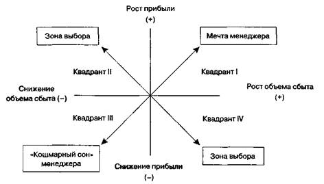 Не все менеджеры понимают, как трудно достичь положения квадранта I. Одновременное преследование целей повышения прибыли и объемов сбыта достижимо, скорее всего, благодаря новой продукции. На рис. 5.9 представлены четыре квадранта, характеризующие направления изменения прибыли и объема сбыта при изменении цены [154].