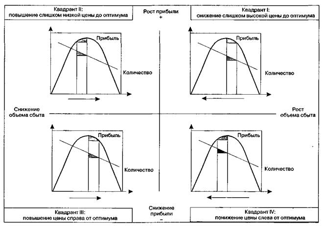 В квадранте I представлена ситуация одновременного роста прибыли и объема сбыта, которая может возникнуть в том случае, если предприятие снижает цену, которая к моменту снижения была выше оптимальной. Чтобы оказаться в квадранте I, нужно было сделать ошибку в прошлом, а именно установить слишком высокую цену. Ситуации, представленные в квадрантах II и IV, встречаются на практике довольно часто, а именно или растет прибыль, или растет сбыт, но не то и другое одновременно. В квадранте II текущая цена ниже оптимальной. Поэтому повышение цены увеличивает прибыль, одновременно снижая объем сбыта. По-