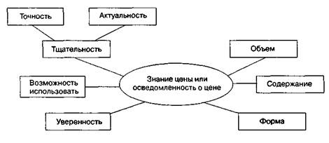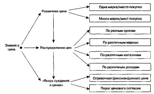 Выделяются четыре так называемые стратегии упрощения ценового поведения покупателя, в особенности по товарам краткосрочного пользования: • потребитель имеет склонность к временному перемещению информационной • это перемещение характеризуется переходом от активного к пассивному при • так как спрос теперь ориентируется на предлагаемую при покупке ценовую • дополнительно упрощение ценового поведения осуществляется через исполь Под знанием ценыпонимается всякая информация, получаемая из долговременной памяти потребителя и значимая для субъективной оценки выгодности покупки желаемого продукта (услуги) с точки зрения цены. Знание цены, которое еще часто называют осведомленностью о цене, описывается следующими характеристиками (рис. 5.10). В начальных исследованиях знания цены акцент был сделан на тщательности и объеме знания цены, т. е. на том, как покупатели могли точно вспомнить цены каких-нибудь продуктов. Дальнейшими аспектами знания цены стали субъективная уверенность в возможности вспомнить цены и возможность переработать знание цены в ценовую информацию. Под содержанием знания ценыпонимаются предметы и качество хранимой в памяти ценовой информации. При этом важное значение имеет форма знания цены. Первый опыт по структуризации содержания знания цены в рамках опроса потребителей по десяти категориям продуктов представлен на рис. 5.11. Потенциальное содержание знания цены характеризуется как имеющаяся в распоряжении информация о розничных ценах, их распределении и об «якоре» суждений о ценах. Последнее является результатом связи знания о розничных