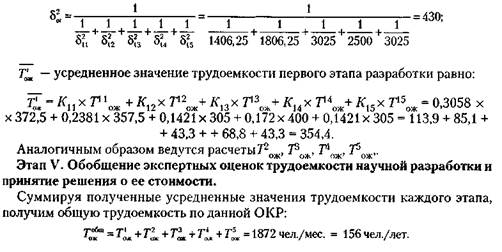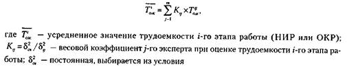 4. Определение усредненного мнения экспертов для установления среднего значения трудоемкости каждого этапа работы. Оценка усредненного ожидаемого значения трудоемкости каждого этапа осуществляется путем нахождения средневзвешенного значения по наблюдениям всех экспертов по формуле: