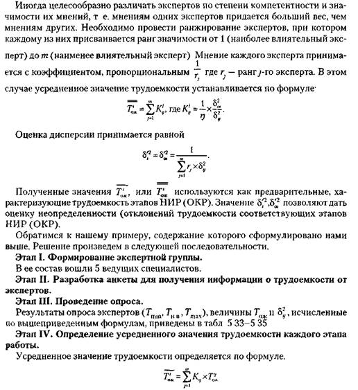 1) эскизный проект; 2) технический проект; 3) разработка конструкторской документации; 4) изготовление опытного образца; 5) испытание и корректировка документации. 5.5. Методы ценообразования 383 Исходным моментом для определения цены новой разработки является оценка трудоемкости. Определение трудности ОКР методом экспертных оценок состоит из следующих этапов: а) формирование группы экспертов; б) разработка анкеты для получения информации о трудоемкости от экспертов; в) проведение опроса; г) анализ ответов, определение усредненного мнения экспертов для установле д) обобщение экспертных оценок трудоемкости изготовления ОКР и принятие Наиболее ответственным этапом является формирование группы экспертов Специалисты должны быть компетентными в рассматриваемой области. В состав группы должны включаться научный руководитель (главный конструктор), ведущие специалисты. Численный состав группы должен определяться видом работ, их сложностью, новизной и т. д. Группа экспертов должна состоять из 3-7 человек. При проведении опроса могут использоваться индивидуальный, групповой, дельфийский методы опроса. Как показывают исследования, для определения трудоемкости НИР и ОКР лучше использовать индивидуальный опрос. Известно, что трудоемкость НИР, а в отдельных случаях и ОКР носит вероятностный характер, так как она зависит от множества трудноучитываемых факторов. В связи с этим можно предположить, что распределение случайных значений трудоемкости описывается р-распределением. Применение р-распределения позволяет использовать метод трех оценок для оценки основных параметров распределения — среднего значения (математического ожидания) и среднеквадра-тического отклонения. В этом случае применяются экспертные оценки минимально возможной трудоемкости работы — Тmin, максимально возможной — Тmах и наиболее вероятной — Т нв По этим величинам при помощи формул оценивается ожидаемое значение трудоемкости — Тол, (математическое ожидание распределения) и дисперсия б2: