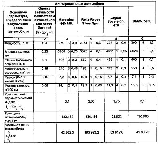 Расчет удельных цен в данном случае включает в себя: 1) выбор основных параметров продукта и их численных значений; 2) оценку степени значимости этих параметров для потребителей; 3) оценку основных параметров по силе проявления путем присвоения им соот Данный метод рассмотрим на примере автомобилей класса «люкс» [149]. В группу входят четыре автомобиля Модели автомобилей, их параметры и удельные цены представлены в табл. 5.39. В графах 3-6 представлены соответственно количественные значения соответствующих параметров, значение ранга каждого параметра, значение ранга, скорректированного на показатель важности параметра для покупателя. Например, возьмем параметр мощности. В графе 3: 279 л. с — величина мощности, 3 — значение ранга мощности, 0,9 — ранг мощности, скорректированный на показатель важности мощности для покупателя (Iij) (0,9 = 0,3 х 3). Если посмотреть на удельные цены автомобилей класса «люкс», можно увидеть, что покупатель отдаст предпочтение автомобилю «BMW-750 IL», так как у него самая низкая удельная цена. Какую информацию несет данная таблица для политики цен «Mercedes-560 SEL»? Мы видим, что комплексный параметрический индекс у «Mercedes-560 SEL» такой же, как и у «BMW-750 IL», а именно 3,1. Однако удельная цена у «Mercedes-560 SEL» выше"удельной цены «BMW-750 IL» на 1016,8 DM. Чтобы прийти к цене «BMW», необходимо снизить цену на «Mercedes» до уровня 130 000 DM. Каждое дальнейшее снижение цены «Mercedes» принесет ему ценовую выгоду по сравнению с «BMW». Другая рыночная возможность для «Mercedes» может состоять в том, чтобы посредством подходящих маркетинга-