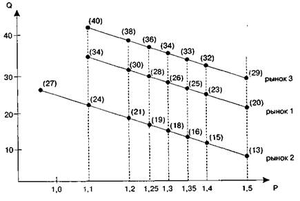 ОПРЕДЕЛЕНИЕ ЦЕН И НАХОЖДЕНИЕ ФУНКЦИИ СПРОСА НА НОВЫЙ ПРОДУКТ НА ОСНОВЕ ОПРОСА ЭКСПЕРТОВDate: 2015-10-07; view: 426. Данный метод определения цены нового продукта рассмотрим на следующем примере. Пример. Требуется определить цену нового продукта, который намечается продавать в трех регионах. Для решения поставленной задачи выбираются лучшие эксперты-менеджеры. Они должны оценить соотношение между ценой и объемом спроса, с тем чтобы выявить точки кривой «цена-объем спроса». Экспертам предлагается дать три оценки: наименьшая реальная цена и ожидаемый при этой цене объем сбыта; наивысшая реальная цена и ожидаемый при этой цене объем сбыта; ожидаемый объем сбыта при усредненной цене. Условные результаты опроса приведены в табл. 5.42. Таблица 5.42. Цены и ожидаемые объемы сбыта