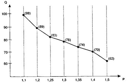 Рис. 5.25.Агрегированная линия «цена-объем сбыта» Представим результаты опроса графически (рис. 5.24). Применяемая для всех регионов единая цена объединяет оцениваемые объемы сбыта в агрегированную линию «цена-объем сбыта» (рис. 5.25). Агрегированный объем сбыта представлен в табл. 5.43. Наибольшая сумма покрытия достигнута при цене 1 руб. 40 коп. 5.5. Методы ценообразования Таблица 5.43. Единая цена и агрегированный объем сбыта