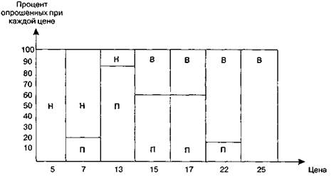 НА ОСНОВЕ ТЕСТА «ЦЕНА-РЕАКЦИЯ ПОКУПАТЕЛЕЙ»Date: 2015-10-07; view: 455. ОПРЕДЕЛЕНИЕ ЦЕНЫ НА НОВЫЙ ПРОДУКТ Цель теста — выявить реакцию потенциальных покупателей на уровень цены. Для поиска цены нового продукта фирма разрабатывает анкету, в которой представлен ряд возможных цен. Потенциальных покупателей просят отметить те уровни цен, которые для них приемлемы (П), высоки (В), низки (Н). Результаты опроса пяти опрошенных потенциальных покупателей сведены нами в табл. 5.47. Таблица 5.47. Результаты опроса покупателей