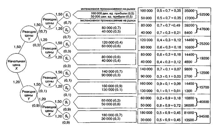 При этом допускаются следующие варианты поведения: • предприятие X совсем не реагирует на поведение предприятия Y (S1 и S8); • предприятие X ведет себя как предприятие Y (S2 и S6); • предприятие X ведет себя противоположно предприятию У (S3 и S7); • предприятие Среагирует на цены предприятия У, последовательно снижая цену Допустим, что предприятие X ожидает от предприятия У реакции со следующими вероятностями (табл. 5.53). Расчет ожидаемой прибыли при различных стратегиях цен с учетом вероятностей представлен на рис. 5.29. Общие суммы ожидаемой прибыли по каждой стратегии сведены в табл. 5.54. Как видим, стратегия 8 обеспечивает наибольшую сумму ожидаемой прибыли. По результатам исследования предприятие X должно установить цену 1,20 и сохранять ее неизменной. Определение цен с ориентацией на конкуренцию дает очевидные выгоды. Она предотвращает «войну цен», от которой страдают все участвующие конкуренты. Эти методы просты и удобны и особенно ценны, когда трудно определить затраты, реакцию конкурентов и спрос. С помощью методов, ориентированных на конкуренцию, предприятия пытаются удержать свою долю рынка или достичь своей прибыли на уровне среднеотраслевой. Вместе с тем этот метод обладает недостатками. Конкуренты имеют различную структуру затрат, цели, сбытовые и финансовые возможности по сравнению с рассматриваемым предприятием. Далее, товар данного предприятия может восприниматься покупателями как значительно лучший, чем товар конкурента. Отказ от учета этих факторов может приводить к недополучению предприятием потенциальной прибыли. К ценообразованию с ориентацией на конкуренцию относится тендерное ценообразование. Этот метод используется в тех случаях, когда несколько фирм конкурируют друг с другом в борьбе за получение контракта. Чаще всего это бывает, когда фирма участвует в объявляемых правительством тендерах. Тендер представляет собой письменное заявление цены фирмой. При назначении своей цены фирма исходит прежде всего из цен, которые, по ее мнению, будут назначены конкурентами. Заказ получит фирма, которая предложит цену ниже цен конкурентов. Цель участия в тендере может быть разная: или надежда, что в будущем фирме будут предлагаться другие заказы, или максимизация прибыли, или дозагрузка мощности предприятия. Чтобы повысить вероятность получения
