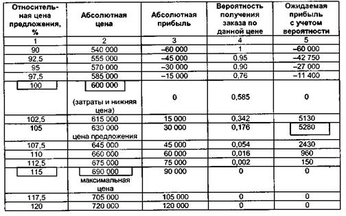 щим шагом является расчет абсолютных сумм прибыли (графа 3) и их корректировка с учетом вероятности получения заказа (графа 4) при всех указанных ценах (графа 5). В результате выбирается та цена предложения, которая обеспечивает получение максимальной прибыли. Такой является цена 630 000. Таблица 5.58. Расчет тендерной цены
