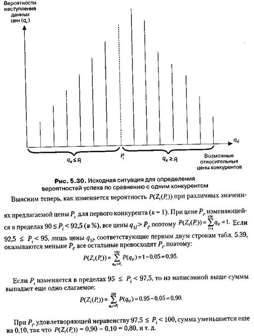 в виду следующее. Если общее число наблюдений равно или больше 100, то для дальнейшего исследования можно привлекать эмпирические распределения (частоты). Если же имеется малое число наблюдений, то эмпирические распределения надо подвергнуть проверке через критерий Пирсона Х2. На втором шаге нужно определить вероятность успеха предприятия по сравнению с отдельным конкурентом. Здесь рассматривается тот случай, когда конкурент делает предложение с уверенностью, что получит заказ, а рассматриваемое предприятие получит этот же заказ от мэрии, если только его цена будет ниже цены конкурента (рис. 5.30). На рис. 5.30 по оси абсцисс нанесены возможные относительные цены конкурентов, на оси ординат — соответствующие вероятности P(qkl). Исходным моментом является желаемая цена предложения предприятия Pt Для возможных конкурентных цен, которые меньше или равны цене предприятия Pt, условная вероятность успеха равна нулю; для тех конкурентных цен, которые превосходят Pt условная вероятность успеха равна единице. По формуле полной вероятности (табл. 5.59, графа 4) вероятность успеха P(ZK(Pt)) против конкурента К при собственной цене Рt оказывается равной: