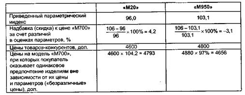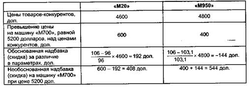 Эти приведенные к единому знаменателю индексы представляют собой на самом деле надбавки к цене и скидки с нее за различие параметров конкурентных машин в сравнении с машиной «М700». Цена на машину «М20» установлена на уровне 4600 долларов, а на машину «М950» - 4800 долларов. Руководство фирмы стоит перед проблемой. Если утвердить на машину «М700» первоначально рассчитанную цену - 5200 долларов, то она будет значительно выше цен обеих конкурентных машин. Если по отношению к машине «М20» эта цена в какой-то мере может быть оправдана (так как машина «М20» имеет более низкий приведенный индекс — 96,0), то намного труднее оправдать эту цену по отношению к машине «М950», приведенный параметрический индекс которой 103,1, а цена на 400 долларов ниже. Фирма проводит расчет оправданных и неоправданных надбавок, которые заложены в первоначальной цене 5200 долларов щ.^М70,0» (табл. 5.6Ю.