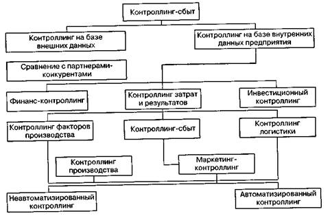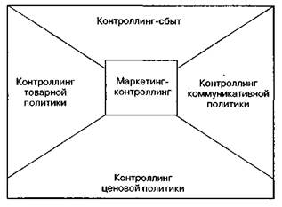 Рис. 6.12.Контроллинг-сбыт как составной элемент маркетинга-контроллинга Цель контроллинга-сбыта состоит в повышении экономической эффективности сбытовой деятельности и самой организации сбыта. Достижение этой цели обеспечивается гибким, оперативным предупреждением недостатков в сбытовой деятельности, их обнаружением и устранением посредством комплекса эффективных мероприятий. Цели контроллинга-сбыта должны быть увязаны и скоординированы с другими сферами контроллинга, такими как финансовый контроллинг, контроллинг затрат и результатов, инвестиционный контроллинг, контроллинг производства и т. д. (рис. 6.13). Основными функциями контроллинга-сбыта являются планирование, обеспечение информацией, контроль (наблюдение), регулирование (управление). Функция планирования охватывает формулирование целей сбытовой деятельности или их корректировку, а также формирование необходимых плановых показателей сбыта продукции. Функция обеспечения информацией включает координацию потребности в информации с ее предложением, а также обработку и подготовку оперативных данных. Для этого используются внутренняя информация предприятия, источники информации о рынке, факторах окружающей среды. Структурирование информации осуществляется в рамках требований бухгалтерского учета, производственного учета и установленных показателей, а также индексов отчетности. Получен-