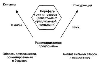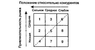 Рис. 6.16.Области стратегического анализа преимуществ деятельности предприятия на рынке зрения и высокорентабельных товаров, которые формируют высокую рыночную привлекательность производственной программы фирмы. Ист-анализ дает возможность установить, надо ли укреплять позиции фирмы относительно конкурентов, и если надо, то в каких областях. Поскольку конкурентная среда подвержена постоянным изменениям, например из-за ценовой или товарной политики конкурентов, необходимо следить за их поведением для принятия соответствующих мер по укреплению позиции фирмы на рынке. Ист-анализ позволяет оценить состояние фирмы, ее позицию на рынке с точки зрения привлекательности и преимуществ, которыми она обладает на том или ином рынке. По этим двум критериям определяют позицию фирмы, характеризующую стратегию предприятия на рынке, а также распределяют ограниченные ресурсы между различными товарными рынками, на которых она представлена.