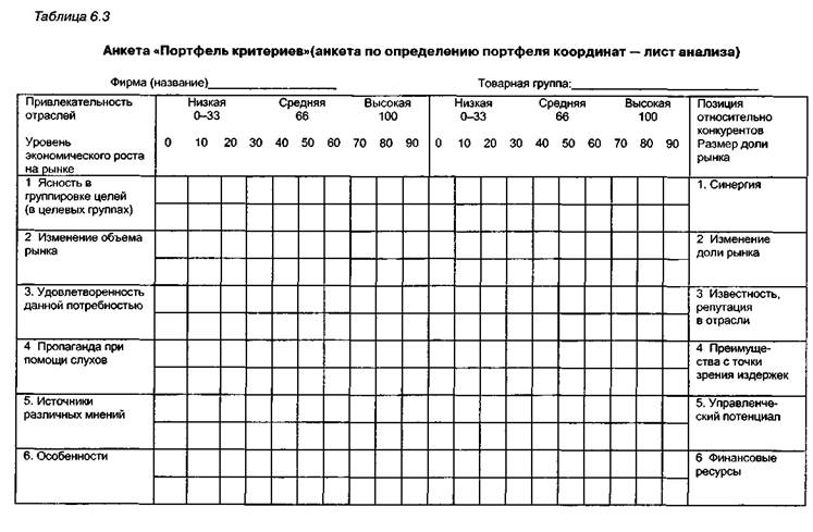 Для определения направлений деятельности в динамике строят матрицу (в координатах привлекательности рынка и преимуществ относительно конкурентов) характеризующую портфель, набор позиций деятельности фирмы на рынке с имеющимся товарным ассортиментом (рис. 6.17). Портфель рынков товара служит 6.2. Организация и контроллинг в системе сбыта 457 инструментом детального исследования направлений деятельности фирмы и оптимального распределения ресурсов. Привлекательность рынка и позиция предприятия в конкурентной среде почти всегда не соответствуют друг другу, поэтому на практике трудно сразу определить область, в которой находится товарная группа фирмы. Тем более что критерии оценки привлекательности рынка, а также оценки позиции предприятия в конкурентной среде слишком примитивны и неточны. Поэтому дополнительно к портфельному анализу рекомендуется использовать анкету «Портфель критериев» (табл. 6.3), которая помогает более конкретно установить положение фирмы на товарном рынке. В табл. 6.4 и 6.5 содержатся пояснения критериев привлекательности и оценки позиции фирмы в конкурентной среде. Анализ преимуществ слабых сторон— SWOT-анализ (Strengths — сильные стороны; Weaknesses — слабые стороны; Opportunities — возможности; Treats — опасности) особенно необходим на рынке, который находится в стадии экономического спада, где имеется избыточная емкость, а конкуренция проявляется наиболее отчетливо. В такой ситуации выявление слабых сторон собственной фирмы относительно конкурентов позволяет частично устранить эти недостатки, а относительно сильные стороны (преимущества) еще более целенаправленно использовать, поддерживать и развивать. При проведении сравнительного анализа сильных и слабых сторон необходимо уделять внимание тем характеристикам, показателям, которые наиболее значимы с точки зрения покупателей. Наиболее эффективную помощь в этом могут оказать личные контакты, беседы с существующими и потенциальными клиентами. Основными критериями, которые должны учитываться и по которым может осуществляться оценка слабых и сильных сторон, являются: • монополия на определенную технологию производства товара или оказание • высокий уровень качества товара; • возможность сервисного обслуживания до и после продажи товара; • гибкость при выполнении специальных пожеланий клиентов; • скорость поставки товара, выполнения заказа; • надежность поставки товара установленного объема и в необходимые сроки; • квачификация сотрудников, работающих по прямым контактам с покупателями; • возможность установления устойчивых связей с постоянными клиентами. Наряду с приведенными критериями в каждом конкретном случае предприятие должно самостоятельно разрабатывать анкету, в которой необходимо отражать критерии, наиболее важные с точки зрения покупателей, формирующих спрос на товар фирмы. Для сравнения и анализа сильных и слабых сторон фирмы и конкурентов можно пользоваться табличной формой, где каждый критерий получает оценку, которая отмечается точкой, а затем эти точки соединяются ломаной линией. Анализ этих линий — своего предприятия и фирм-конкурентов — позволяет сделать объективные выводы и разработать основные мероприятия по устранению слабых и развитию сильных сторон поведения собственной фирмы на рынке (табл. 6.6), а также проанализ