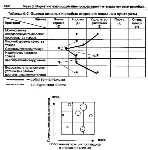 можно назвать «здоровой», когда большая часть поставок осуществляется по заказам покупателей с высоким потенциалом, т. е. наиболее привлекательных клиентов. Включение в «портфель клиентов» потенциальных покупателей позволяет определить перспективы и задачи фирмы по увеличению сбыта продукции «желательным кандидатам», у которых имеются большие финансовые возможности по приобретению товара фирмы. На рис. 6.18 такой потенциальный покупатель изображен точкой на том или ином уровне привлекательности, но с объемом поставок, равным нулю. Прогнозирование возможных рисков, опасностей и шансов на рынке сбытаосуществляется после исследования сильных и слабых сторон фирмы относительно конкурентов и анализа структуры покупателей. Предварительная картина ста-