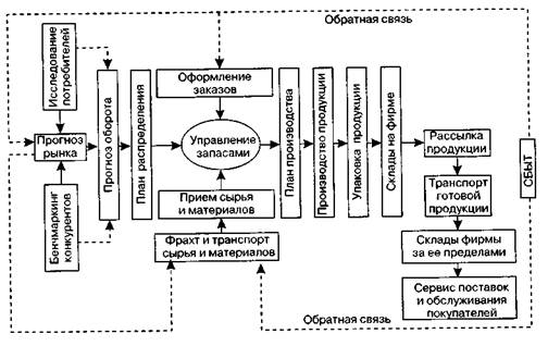 Рис. 6.23.Процесс маркетинг-логистики сбыта; планирование распределения; фрахт, заключение договора о поставке и приобретении сырья и материалов для производства товаров, имеющих спрос; организация приема сырья и материалов; организация складирования и контроль запасов сырья и материалов; оформление заказов с торговыми организациями или отдельными потребителями продукции фирмы; планирование производства; производство продукции; упаковка продукции; организация хранения готовой продукции на складах внутри территории фирмы; рассылка товара; организация транспорта готовой продукции; организация хранения готовой продукции на складах фирмы, расположенных за пределами ее территории; сервисное обеспечение поставок и обслуживание покупателей; сбыт. Процесс маркетинг-логистики характеризует технологию физического распределения товара и определяет основные ее функции, а также комплекс маркетинговых решений по реализации задач маркетинг-логистики. Основными функциями маркетинг-логистики являются: исследование, планирование, реализация и контроль физических потоков материалов и готовой продукции при перемещении их от производителя до конечного потребителя (рис. 6.24). Важнейшими задачами маркетинг-логистики могут быть (в зависимости от развитости этой подсистемы маркетинга на фирме): • организация исследования требований и заказов потребителей, а также бенч- • обоснование и организация информационного обеспечения маркетинг-логис