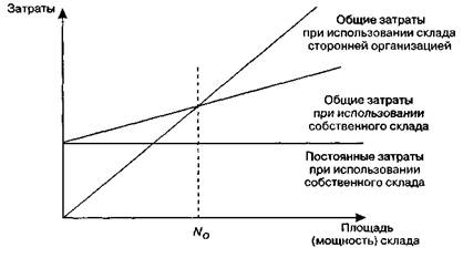 Данный подход к оценке эффективности системы маркетинг-логистики носит методический характер. В каждом конкретном случае должны быть оценены затраты и результаты создания отдельного подразделения или комплекса маркетинг-логистики, сопоставление которых дает возможность оценить их целесообразность. Например, критерием целесообразности создания собственного товарного склада может быть превышение годовой экономии на затратах по перевозке товара и по обеспечению готовности поставки товара над затратами по сооружению и эксплуатации склада, соразмерных во времени. В такой ситуации могут рассматриваться варианты аренды, лизинга или сооружения товарного склада. При этом необходимо учитывать факторы независимости и гибкости поставок при наличии собственного склада. Выбор варианта — собственный склад или склад специализированной посреднической фирмы — зависит от выбора места сооружения (аренды) товарного склада, которое определяется как свойствами и особенностями товара, так и условиями, факторами окружающей среды, где располагается товарный склад. Основными факторами, которые необходимо учитывать при выборе места сооружения или аренды склада, являются: требуемый уровень поставки; инфраструктура области сбыта; динамика спроса; состояние транспортных сетей; уровень возможных транспортных затрат и затрат на складирование. При сравнении вариантов складов необходимо принимать во внимание, что с ростом мощности склада пропорционально увеличиваются затраты на их содержание; при эксплуатации собственного склада добавляются еще и постоянные расходы. Задаваясь мощностью склада, можно определить точку равновеликих затрат (No) (рис. 6.25). При решении вопроса о мощности сооружаемых складов необходимо учитывать, что при увеличении числа складов ускоряется процесс доставки товаров, но