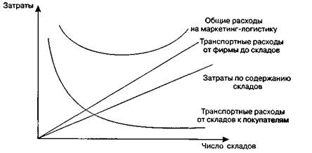 Рис. 6.25.Характеристики затрат на использование собственного склада или склада сторонней организации при этом растут затраты на содержание этих складов. В этом случае критерием должно быть соблюдение баланса между уровнем затрат на создание сервиса обслуживания покупателей и затратами на распределение товара. С увеличением числа товарных складов, с одной стороны, снижаются транспортные расходы от склада до потребителя, а с другой стороны, повышаются затраты по эксплуатации товарных складов и транспортные расходы от фирмы-производителя до склада (рис. 6.26). Рассмотрим дополнительные признаки, которые целесообразно учитывать при принятии решения о варианте складирования.