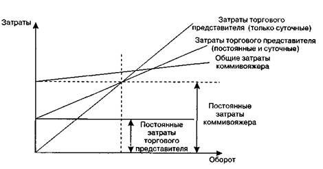 Рис. 6.26.Затраты на маркетинг-логистику в зависимости от числа складов Коммивояжер является служащим торговой фирмы и подчиняется распоряжениям своего предприятия. В основе сравнения этих вариантов — положение о том, что привлечение торгового представителя требует постоянных расходов, но меньших, чем при работе с коммивояжером, тогда как переменные затраты в варианте с торговым представителем растут быстрее, чем с коммивояжером. Характеристика этих затрат в зависимости от товарооборота приведена на рис. 6.27. Следовательно, с точки зрения затрат — при определенных обороте и условиях (небольшие суточные и постоянные расходы) — приоритет может быть отдан коммивояжеру.