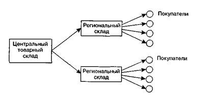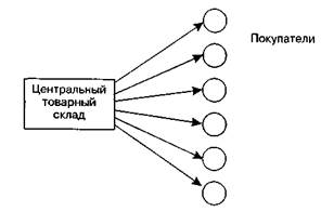 где Спост — удельные постоянные затраты на единицу заказа, руб.; V1 — переменные затраты на производство продукции, % от оборота; V2 — переменные затраты на сбыт, % от оборота. Выбор собственного транспорта или услуг транспортной специализированной организации осуществляется с учетом удаленности потребителя, скорости, частоты и надежности поставок, пропускной способности, доступности, загруженности транспортных линий, а также стоимостных показателей, используемых топлива и энергии. Доставка товаров может осуществляться железнодорожным, воздушным, автомобильным, водным и трубопроводным транспортом. При выборе вида транспорта наряду со стоимостными затратами (транспортные расходы, складские расходы, затраты на упаковку и т. д.) существенную роль играет учет таких свойств товара, как возможность порчи, потери массы, размер товара. Кроме того, учитываются затраты, вызванные потерей заказов из-за несвоевременной поставки, утрата имиджа вследствие задержки поставок, а также штрафы за несоблюдение условий поставок. Исходным пунктом анализа при сравнении вариантов обеспечения транспортными средствами должны быть затраты. Выбирается вариант с меньшими затратами. Выбор вида транспорта осуществляется с учетом числа и вида товарных складов. Так, например, при высоких транспортных расходах, низких затратах на складирование и несрочных условиях поставки эффективной может быть транспортировка с единого централизованного товарного склада (рис. 6.28). А при невысоких транспортных затратах, больших складских расходах и при условиях срочной поставки рациональным может быть частичное делегирование транспортных услуг сторонней транспортной организации (рис. 6.29).